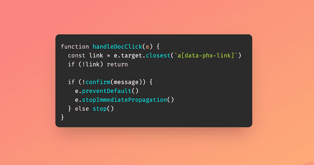 window.addEventListener(`phx:stop-beforeunload`, stop)Everything starts with phx:*-beforeunload listeners that can be initiated from either server or client side. That leads to browser-native beforeunload handling to cover typical navigation cases, and handleDocClick that handles Phoenix’s link clicks and fires up a confirmation dialog with a custom message.